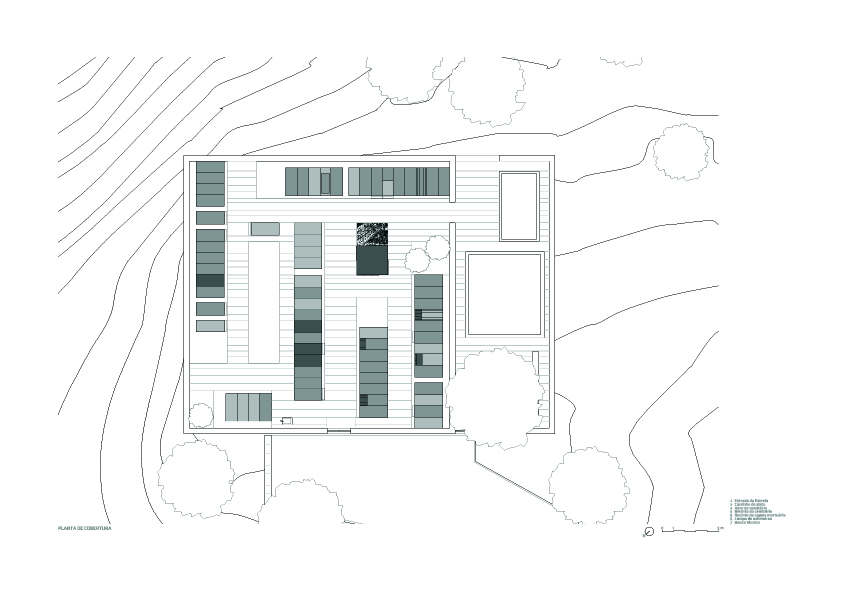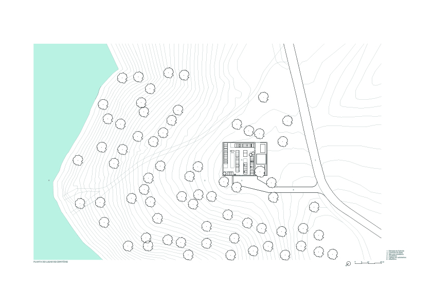 The cemetery and mortuary chapel constitute an ensemble of two enclosed spaces, built in a holm-oak field. One of the holm-oaks becomes part of the enclosure, as an element of the cemetery anchorage, transforming the chapel patio into an important shadow space. This gesture acquires a structural significance, either in the dialogue between built and landscape, or in the character of the chapel interior space, built with holm-oak wood, recycled from the fell of trees in the new lagoon river-side.