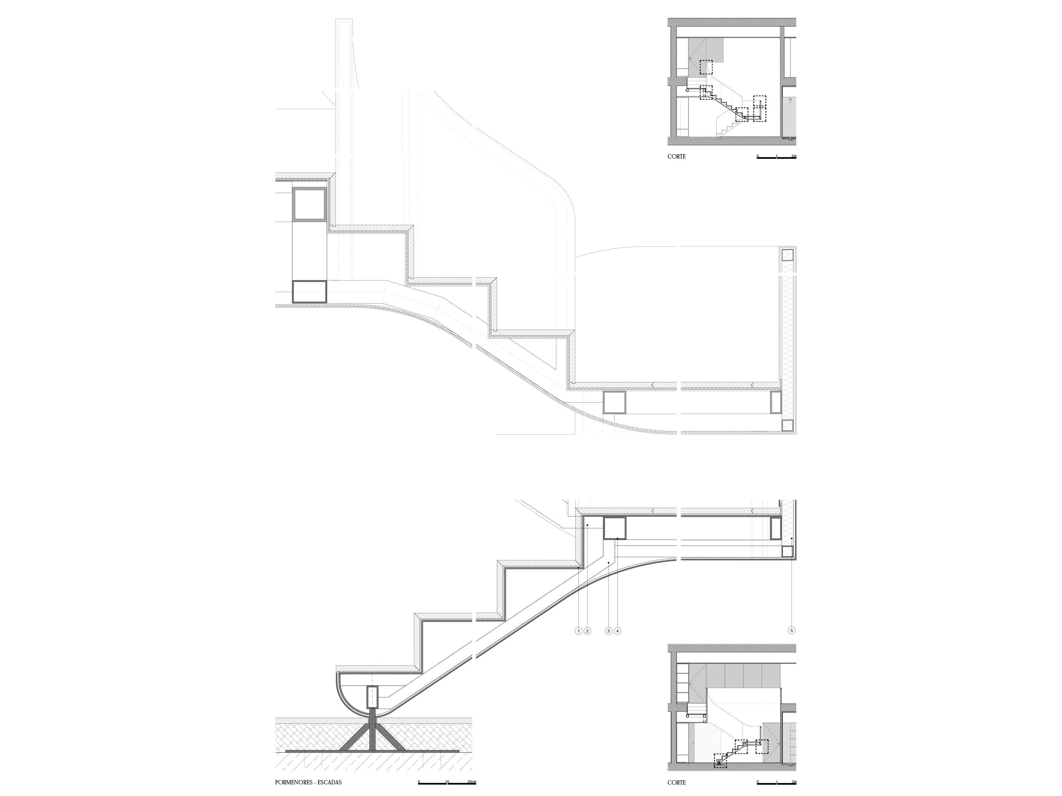 O piso superior será a área privada da habitação, composta por três suites, a do casal e as dos dois filhos. A unificação dos dois pisos e, consequentemente, da habitação, faz-se através da introdução de um hall de pé-direito duplo com a escada de acesso, desenhada como peça central e distribuidora de todo o programa. A escada desenha ainda, no piso superior, um varandim com vista sobre o piso inferior. Todo o apartamento foi desenhado tendo em consideração as características dos materiais escolhidos num jogo de volumes, claro e escuro. O piso inferior, social, é unificado pelo pavimento em mosaico hidráulico de produção manual, num padrão que introduz textura e tridimensionalidade. Define-se em todo este piso uma altura de escala humana, ora pela diferença de pé-direito, material ou cor, que percorre e unifica todo o espaço. A suite principal é desenhada em quatro espaços, segue-se a área de dormir e, a esta, a área de vestir com acesso à instalação sanitária. As duas suites menores encontram-se do lado oposto do hall central e possuem, cada uma, uma instalação sanitária em vidro e espelho, com luz natural.