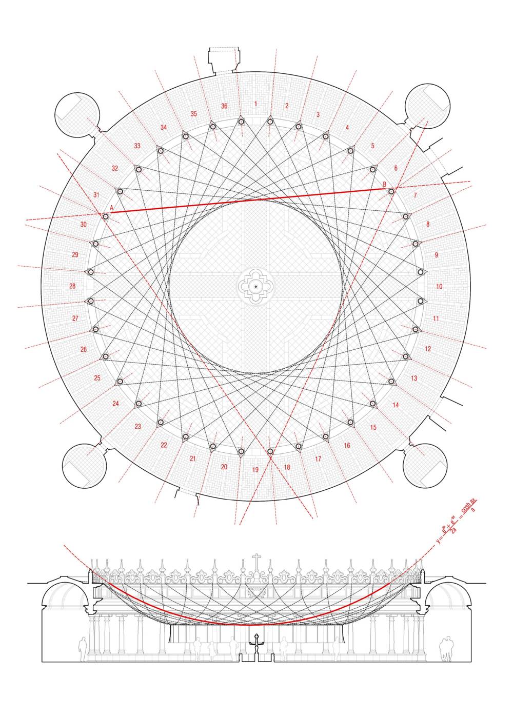 Do ambulatório do claustro, passamos para um espaço com uma cobertura apenas sugerida pelos cabos – um umbral, transição entre exterior coberto e exterior descoberto – até finalmente atingir o céu aberto. Prolonga-se a gradação característica da estrutura tipológica claustral e expande-se centripetamente a sua geometria, a estrutura profunda da sua forma.