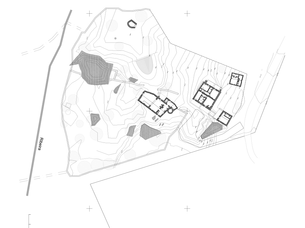 Os primeiros tempos são passados a limpar o terreno e a ribeira e a pensar o que fazer. Decidem-se por tentar recuperar as construções originais, mantendo no possível tudo o que o faz único, mas transformando-o numa habitação. Na organização das diversas casas e muros, a influência da topogra a é óbvia, em especial dos Barrocos. A sua presença é notória, fazendo parte de todo o conjunto, lembrando-nos constantemente outros vestígios megalíticos existentes no Alentejo. O seu papel é fundamental também na estrutura das casas pois foram usadas como alicerces naturais na sua construção. As obras realizadas foram sobretudo de conservação, ou seja, destinaram-se a manter o que se julga original à data da sua construção ou última alteração. Não tendo nenhum registo grá co do local, procurou-se através de sucessivos levantamentos, identificar aquilo que deveria car, ser demolido ou alterado. Os princípios de projecto incidiram sobre três vertentes: limpar a obra, através da remoção de elementos dissonantes; desenhar espaços dentro dos volumes, mantendo ao máximo declives e cotas; utilizar materiais idênticos aos existentes ou reciclados do local, como alvenaria de pedra e telhas antigas.